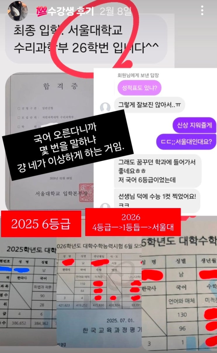 수능 국어 6등급, 실제로 서울대에 갔습니다. 실제 성적표가 있습니다. 수능 국어 6등급. 그 학생이 서울대에 입학했습니다. 어떻게 가능했을까요? 저 장의순T 본인도 어릴 때 책을 거의 읽지 않았고, 고1 내내 국어는 늘 하위권이었습니다. 내신에서 국어 때문에 수시도 떨어졌습니다. 그런데 수능에서 국어 1등급을 받고 서울대에 입학했습니다. 비결이 뭐냐고요? "방법"을 바꾼 게 아니었습니다. "질문"을 바꿨습니다. 13년 현장에서 가장 많이 들은 말 서초 수능국어 현장에서 13년간 학생과 학부모님을 상담하면서 가장 많이 들은 질문이 있습니다. "어떻게 해야 국어 성적이 오를까요?" 국어 성적을 올려야....... <img src="https://blogthumb.pstatic.net/MjAyNjAyMjhfMTUz/MDAxNzcyMjcyOTk0ODQz.UEn9o6cjhVx9eow-gRLskWrHN9puL0iKxul2PKyeyzQg.iWOEpQOuHQzr8WmxScQvNChdCo-RDf3faavthRILDAAg.JPEG/KakaoTalk_20260227_190240286.jpg?type=s3" />