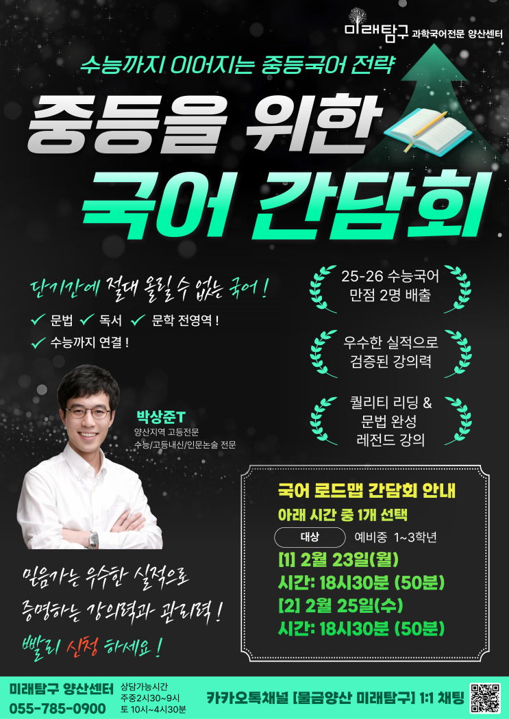 수능까지 이어지는 중등 국어 전략, 제대로 알고 준비하고 계신가요? 4년 재원생 중에서 ✨ 2년 연속 수능 국어 만점자 배출! 그 비결이 궁금하다면, 이번 중학생 대상 국어 수업 로드맵 간담회 에서 확인해보세요! 왜 중등 국어가 중요한가요? 수능 국어는 하루아침에 완성되지 않습니다. 중학교 시기부터 쌓아온 독해력, 사고력, 개념 이해력이 고등 국어 성적을 좌우합니다. 이번 간담회에서는 ✔ 중1~중3 시기별 학습 전략 ✔ 고등·수능까지 이어지는 커리큘럼 설계 ✔ 실제 만점자 배출 로드맵 을 자세히 안내드립니다. [ 신청 방법 ] ☎️ 학원 전화 미래탐구 양산센터 (055.785.0900) 카카오톡 채널 1:1 채팅 ▶ 전화 상담....... <img src="https://blogthumb.pstatic.net/MjAyNjAyMTNfMTA3/MDAxNzcwOTc1Mjk0Njc0.Oo0IKZOolx2QAul7o9vnmwIKKYYz70UucuscT6MYISIg._ASxofsupI-BrOrYUOCMCmpQKHrIpNv2igybx5fKgk4g.PNG/%C1%A6%B8%F1%C0%BB_%C0%D4%B7%C2%C7%D8%C1%D6%BC%BC%BF%E4._%284%29.png?type=s3" />