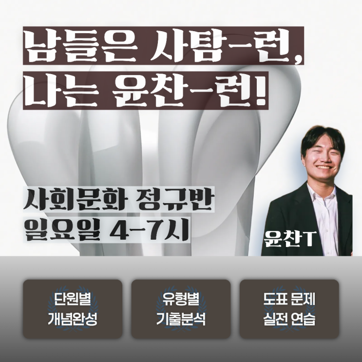 남들은 "그냥" 사탐 런?" 나는 "윤찬 런!!" “남들은 사탐으로 'Run'칠 때 나는 윤찬T 사회문화로 'Learn' 친다” |목동 사회문화 정규반, 1년 커리큘럼 전격 공개 < 8명 정원 소수정예, 수능까지 가는 정규반! > 이런 학생에게 꼭 필요한 수업입니다 사회문화 개념을 처음 시작하는 학생 내신은 물론 수능까지 한 번에 관리하고 싶은 학생 ‘외웠는데 틀리는’ 사회문화에서 구조 이해가 필요한 학생 무작정 암기, 내신식 공부에만 익숙한 학생 또는 내신식 공부도 익숙하지 않은 학생 “남들은 사탐-런, 나는 윤찬-런!” 사회문화는 암기 과목이 아닙니다. 구조를 모르면....... <img src="https://blogthumb.pstatic.net/MjAyNTEyMjFfMjk5/MDAxNzY2MzA1Njk1NjIz.h6bHVCNbyBdznYLjPs_BQ_5ft34itDpu7_Si00TOVCsg.9LItDinuMtiGavXT-xmqM1NGWqyw5cQ4AprNF7OfK1Yg.PNG/2026%B3%E2_1%BF%F9.png?type=s3" />