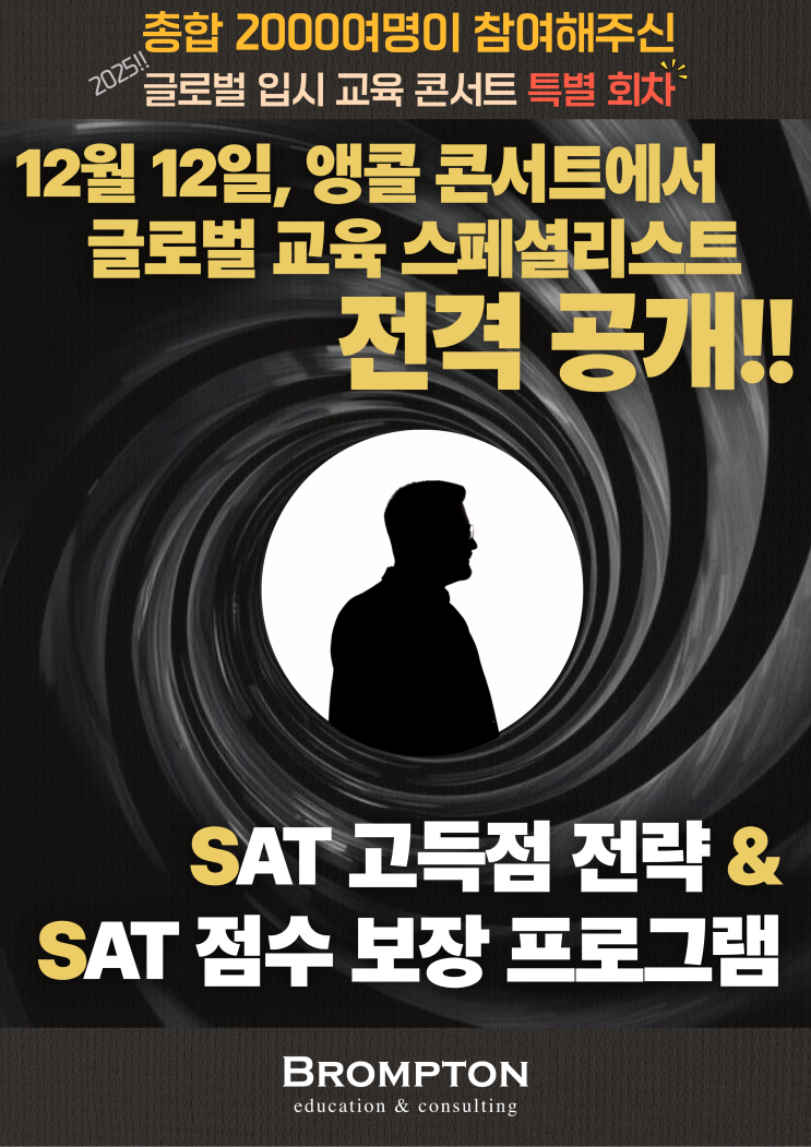 [12/12 앵콜 콘서트] SAT 고득점 전략 & SAT 점수 보장 프로그램 전격 공개! 안녕하세요, 글로벌 입시 전문 브롬튼 에듀케이션 & 컨설팅입니다. 2025 Online 글로벌 입시 교육 콘서트에 지금까지 총 2,000여 명의 학부모님과 학생들이 함께해 주셨습니다. 많은 분들이 “SAT만 따로 집중해서 듣고 싶다”, “디지털 SAT 고득점 전략을 정리해 달라”는 요청을 주셔서, 12월 12일(금) 오전 11시, SAT 앵콜 콘서트를 준비했습니다. SAT 고득점 전략 & SAT 점수 보장 프로그램 디지털 SAT 구조와 출제 경향, 채점 방식 정리 1400·1500+ 점수를 만드는 브롬튼식 학습 로드맵 Reading & Writing / Math 섹션별 공부법과 시간 관....... <img src="https://blogthumb.pstatic.net/MjAyNTEyMDNfMTQ2/MDAxNzY0NzQ0MjI4MjMz.4chH1HP-M2vcntGLzsqg6iZg763Ml1wBFYSTRX0k_G8g.7o85Ebhla-0AhCYOu8nbXnIm5662oYjj0kaBxoAftDEg.PNG/%B1%E0%C1%A4%C0%FB%C0%B8%B7%CE_%283%29_%281%29.png?type=s3" />