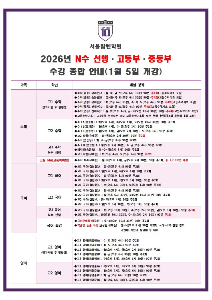 2026년 윈터스쿨 (겨울방학학습캠프) & N수 선행·고등부·중등부 겨울방학 단과 시간표 안내입니다. 예비 고1의 경우 윈터스쿨 신청자와 수학·영어 단과 신청자 모두 12월 23, 24, 26일 중 하루를 선택하여 오후 5시(영어, 50분) 오후 6시(수학, 50분) 래벨 테스트를 반드시 응시하여야 합니다. (시험 결과에 따라 반 편성) 서울탑텐의 겨울방학 수업에는 정규 수업뿐만 아니라 다양한 특강도 개설되어 있으며, 특히 고3과 N수생을 위한 인문논술 특강과 약술형 논술(국어+수학 연합)특강도 마련되어 있습니다. 상담 문의는 평일 3시 이후 토요일 2시 이후 부탁드립니다. #서울탑텐학원 #서귀포서울탑텐학원 #서귀포윈터스쿨 #서울탑텐겨울방....... <img src="https://blogthumb.pstatic.net/MjAyNTEyMTBfOCAg/MDAxNzY1MzU1ODQ4MTc0.0KMp2-udCeHN4JdFAysE82P9lf6sVDCEjF7tLZgbvZwg.qZ4H4-W12_nJ_MDEzNwlqJNDEptr7H_tWfePckWgFHYg.JPEG/%C5%BE%C5%D9__%C1%A4%B1%D4%BC%F6%B0%AD_%BE%C8%B3%BB%BC%AD%28%C0%A9%C5%CD%29001.jpg?type=s3" />