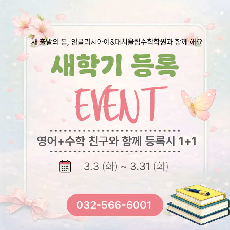 안녕하세요. 잉글리시아이&대치올림수학입니다. 3월 신학기를 맞아 새로 개강하는 CLASS! 신입생 모집을 합니다. 친구 1명이 바꾸는 우리 아이 공부 습관 180도 변화 친구와 함께하면 자신감 2배! 초,중등 영어 수학 시작 게다가 지금은 1+1 이벤트까지 진행 중이라면? 이건 무조건 같이 시작해야 타이밍예요. 친구랑 같이 등록하면 좋은 점 1. 꾸준함이 2배 혼자 하면 빠지기 쉽지만, 친구와 함께라면 서로 챙겨주기 때문에 출석률 UP! "오늘 가기 싫다..." "그래도 약속했잖아, 가자!" 이 한마디가 큰 차이를 만들어요. 2. 비용 부담 DOWN 1+1 이벤트라면 한 명 가격으로 두 명 등록 첫 학습 비용이 반으로 절감 혼자....... <img src="https://blogthumb.pstatic.net/MjAyNjAyMjNfMTM0/MDAxNzcxODQ5MzIwODI4.96glmqITSkcoLDZp32dJlkfDp97Yafkf2IV-lWSPEm4g.VeAcgpP3I-nxwPf05ruBP2vJkflcMotFoQ59dKoTSRsg.PNG/%BB%E7%BA%BB_-_%C4%A3%B1%B8%BC%D2%B0%B3.png?type=s3" />