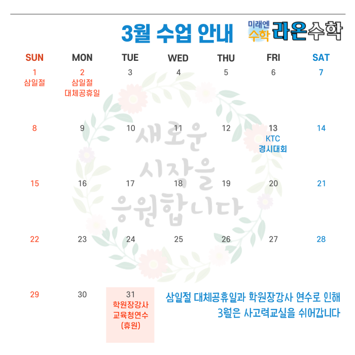 3월 수업 일정 안내 [미래엔 남악 라온 수학 학원]