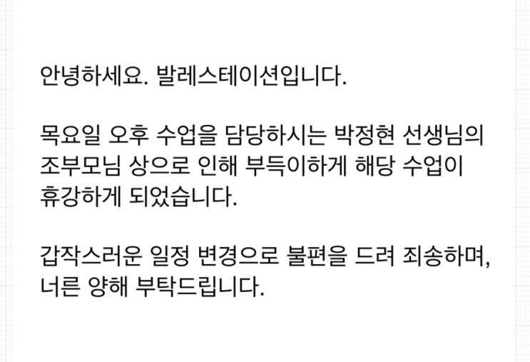 갑작스러운 휴강을 하게 되어서 죄송합니다. 수업은 추후 보강 부탁드리겠습니다. 자세한 문의는 카카오톡@발레스테이션으로 부탁드려요. <img src="https://blogthumb.pstatic.net/MjAyNjAyMTlfMjcz/MDAxNzcxNDc2ODYwMjk5.-FIHLR2XkKm2aHczh9KIl7I15RikmjFY6zYn4QUOPNcg.A5NxZzcFvUaB5kRv2iT0LQ4LPDPLfcWkvhmeSh_u3GMg.JPEG/IMG%A3%DF1770.JPG?type=s3" />