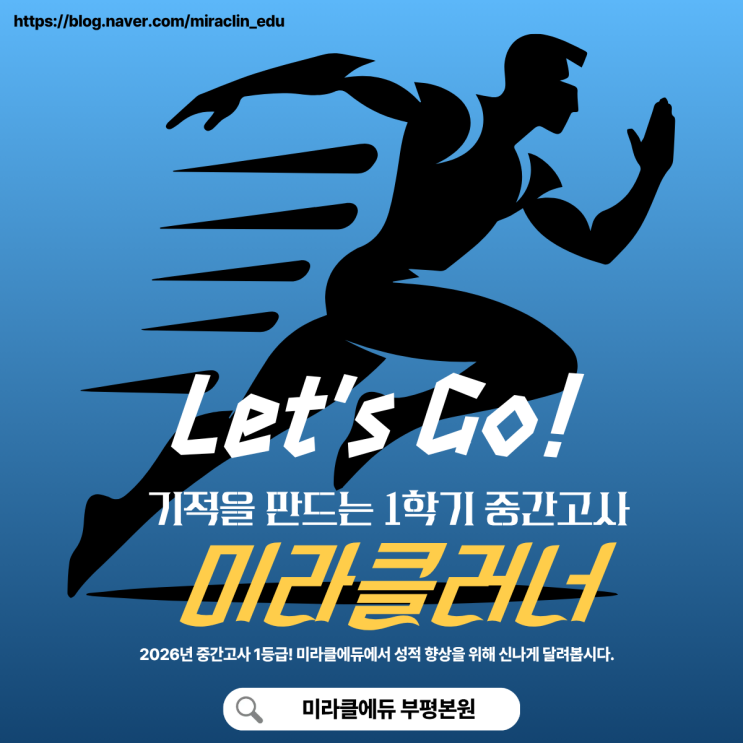안녕하세요? 부평에서 가장 핫한 고등 내신대비 전문 학원 미라클에듀입니다. 설래는 마음으로 시작한 2026년 신학기!!! 이제 1학기 중간고사를 준비할 때입니다. 부평에서 가장 핫한 고등부 전문학원 미라클에듀는 내신과 수능 성적 모두! 여러분이 기대한 그 이상의 기적을 만들기 위해 최선을 다하겠습니다. 우리가 지도하는 모든 학생이 내신과 대입에서 좋은 결과를 얻기를 다짐하며 2026년은 슬로건을 만들었습니다. 2026 기적을 창조하는 미라클러너 내신과 수능 1등급을 만들기 위해 열정을 다해라! 지금에 만족하지 말고 목표를 이루기 위해 노력해라! 우리 아이의 발전을 위해 모든 역량을 발휘하고 달려라! 2026년 미라클에듀가 추구....... <img src="https://blogthumb.pstatic.net/MjAyNjAzMDVfMjU1/MDAxNzcyNzA4NTYxMjA5.hSpDYIc7Hhh_uxij7GTSgZeEZTjSira1iKhc656bnhAg._olb9aV6e8Y3knS9UtGTRAfjWvcmVmjyfM9JWjRIfm0g.PNG/%C1%A6%B8%F1%C0%BB_%C0%D4%B7%C2%C7%D8%C1%D6%BC%BC%BF%E4._-_2026-03-05T200215.776.png?type=s3" />