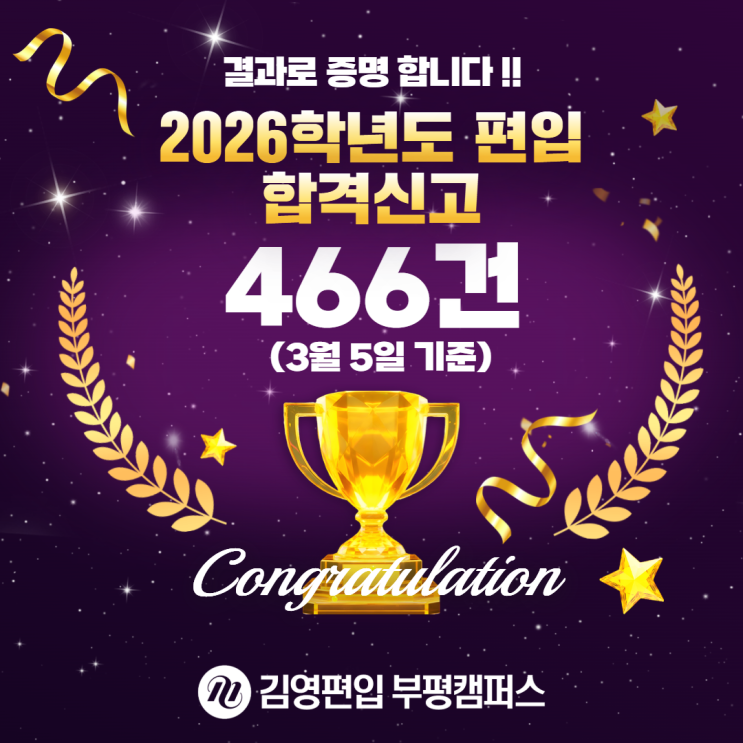 [김영편입 부평캠퍼스] 2026학년도 편입 합격신고 466건 돌파!