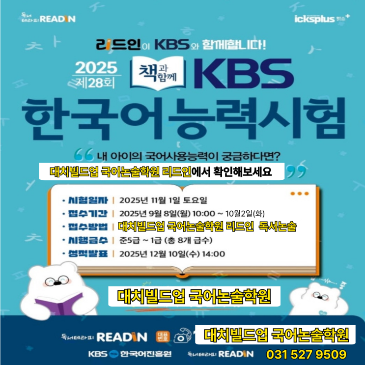 안녕하세요~ 대치빌드업 국어논술학원입니다. 12월10일 제28회 책과 함께, KBS 한국어능력시험 결과 발표가 있는 날이었습니다. 시험이 11월 1일 토요일이었는데 11월3일 월요일부터 “선생님 저 합격했어요?” "선생님 저 몇 점이에요?" "선생님 결과 언제 나와요?” 등 우리 친구들이 결과가 궁금해서 계속 물어 봤는데 드디어 오늘 결과가 나왔습니다~~ 전원 합격했습니다~~~ 넘나 기쁘네요~ 과학 관련 도서가 어렵다고 잘 모르겠다고 하면서도 2번 읽은 우리 친구도 있었습니다~ 각 레벨 별 필독서를 열심히 읽고 처음 OMR 카드에 마킹도 해보며 열심히 준비했는데 모두 합격이라 정말 기쁩니다~~ 저희 학원은 준4급부터 1급....... <img src="https://blogthumb.pstatic.net/MjAyNTEyMTBfMTQ1/MDAxNzY1MzY4Njk5NjY5.s72y5vgNwQpzpiT0dIsHsFWQNX2IP8kHZDfOBOBjz00g.-Yug8QMcPbR8LGc-Ur1tadQHt4fyD7mpQ271jFAfL_Ig.PNG/%C1%A6%B8%F1%C0%BB-%C0%D4%B7%C2%C7%D8%C1%D6%BC%BC%BF%E4_-001_%286%29.png?type=s3" />