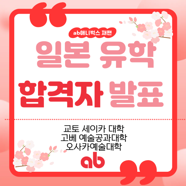 안녕하세요.ab애니벅스입니다! 지난 12월 초에는 일본 미대 유학을 목표로 하는 학생들의 합격발표가 있었는데요! 과연 우리 학생들이 어떤 학교에 합격했는지 보러 가실까요? 일본은 만화 애니메이션을 희망하는 학생들이라면 한 번쯤은 목표로 삼는 곳이기도 하죠. 그만큼 교육과 연계가 잘 되어 있어 교토세이카대학, 고베예술공과대학, 오사카예술대학 등 만화 애니과로서 유학을 목표로 삼기 좋은 학교가 많기도 합니다. 저희 애니벅스 재팬반에서도 위 세 가지 대학교를 합격한 학생들이 나왔는데요! 그동안 너무 고생 많았던 학생들을 위해 축하와 격려의 박수 부탁드립니다 교토세이카대학 스토리만화학과 - 김o윤 애니메이....... <img src="https://blogthumb.pstatic.net/MjAyNTEyMTJfNzcg/MDAxNzY1NTI3MzU0NDk2.Zx0JGiVMhGjyc0f4G2wxvkcDTrNFW9QjvZOgqBM270Ig.aSeJfA8FNkmFDue4mefbJGThvlUSK1wfSPju0I3Y9Gsg.PNG/%C1%A6%B8%F1%C0%BB_%C0%D4%B7%C2%C7%D8%C1%D6%BC%BC%BF%E4._%287%29.png?type=s3" />