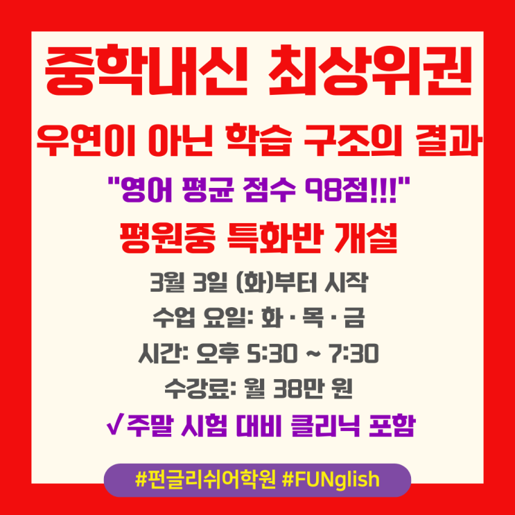 펀글리쉬 중학내신 최상위권!! 우연이 아닌 학습 구조의 결과!!| 원주 무실동 영어학원 펀글리쉬어학원
