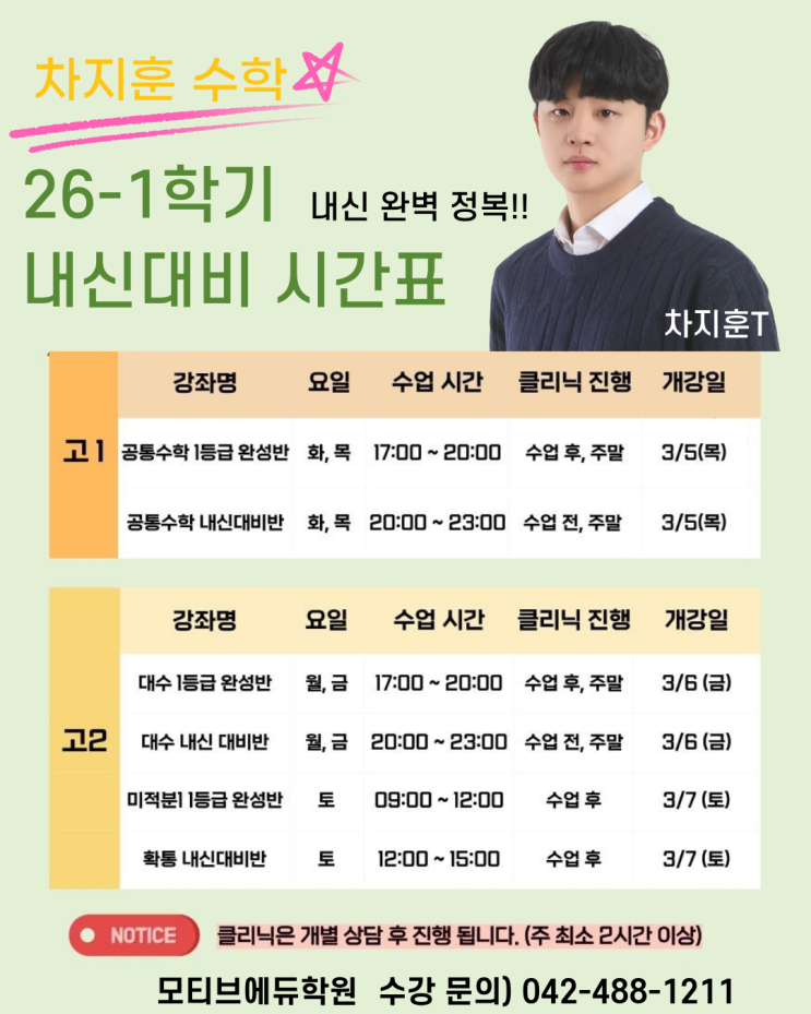 [둔산동 수학학원] 차지훈T 수학 26-1학기 내신대비반 시간표 안내♥️!!