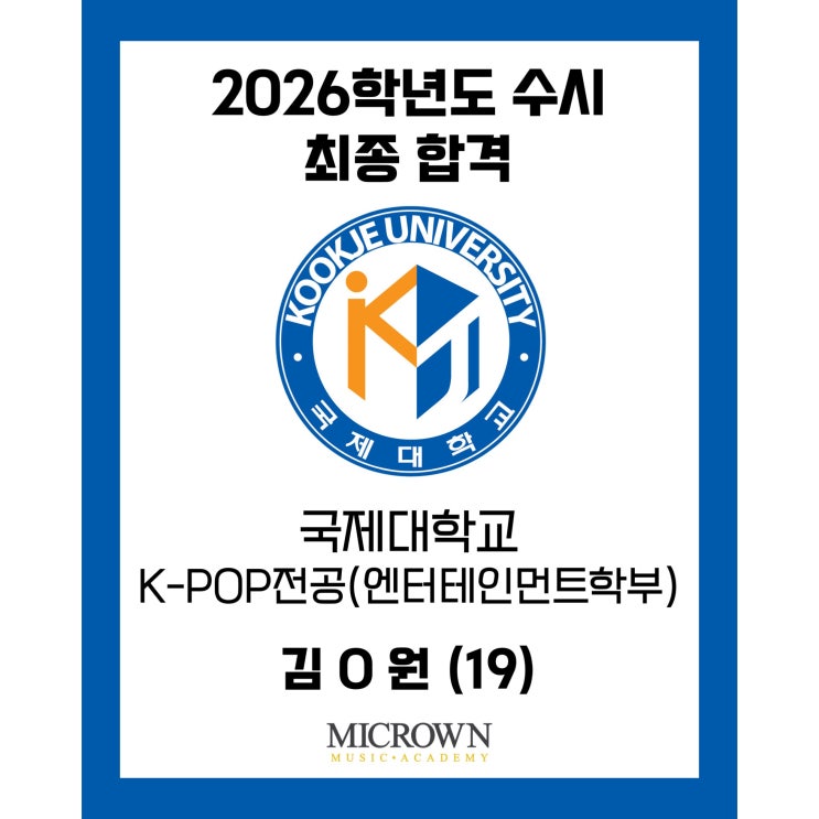 안녕하세요 #전주실용음악학원 마이크라운뮤직아카데미입니다! 김O원 학생이 2026학년도 국제대학교 수시 K-POP전공(엔터테인먼트학부)에 최종 합격 했습니다! 축하합니다 전주 실용음악과 입시 준비는 마이크라운뮤직아카데미에서 함께하세요! [문의 및 상담 예약] 마이크라운뮤직아카데미 전북 전주시 완산구 유연로 294, 3층 운영시간 : 월~토 13:00 - 22:00 (일요일 휴무) 전화 문의 : 063)224-3111 카톡 상담 : @마이크라운뮤직아카데미학원 모든 상담은 원장님 직접 상담으로 진행됩니다. ‼️ 방문 상담 전 미리 예약 필수 ‼️ [네이버블로그] http://blog.naver.com/micrownmusic [인스타그램] h....... <img src="https://blogthumb.pstatic.net/MjAyNTEyMjBfNjIg/MDAxNzY2MjAzNjcwMzc3.gklpqi7la23x5H88yOFazTgK2BA5fson9Y7dB2KybpYg.vSAfo-EwcZd82B5W_ffbxT6XTKIYx0z8ttoA2qJD92Ag.JPEG/ISIMG-1036088.JPG?type=s3" />
