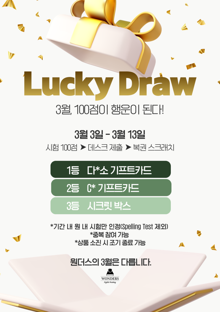 잘 읽은 책 하나 열 문제집 안 부럽다!! 영어독서토론 전문학원 원더스 잉글리시 아카데미입니다^^ 보상이 아니라 ‘학습 태도’를 설계합니다. 학부모님들께서 종종 이렇게 질문하십니다. “이벤트나 보상이 아이에게 정말 도움이 되나요?” “혹시 보상에만 집중하게 되지는 않을까요?” 충분히 하실 수 있는 질문입니다. 그래서 오늘은 왜 원더스가 100점 럭키 챌린지를 다시 진행하는지, 그 교육적 의도를 분명하게 말씀드리려고 합니다. 우리가 축하하는 것은 점수가 아닙니다. 이번 이벤트의 참여 조건은 단순합니다. ✔ 대상: 원더스 재원생 ✔ 시험: Reading Quiz / Vocabulary Quiz / Grammar Quiz (Spelling Test 제외) ✔ 조건: 100점....... <img src="https://blogthumb.pstatic.net/MjAyNjAyMjZfMyAg/MDAxNzcyMDY5NTM4Njc5.-DHsh9wgVluOpAwA9ExR6DzWcn3_Zy6mbM4ywyIVy1Mg.P9DCS1MYIdD40fU2KCsIg2x2AdchpHE6t4Gyv_U3EQAg.PNG/1.png?type=s3" />