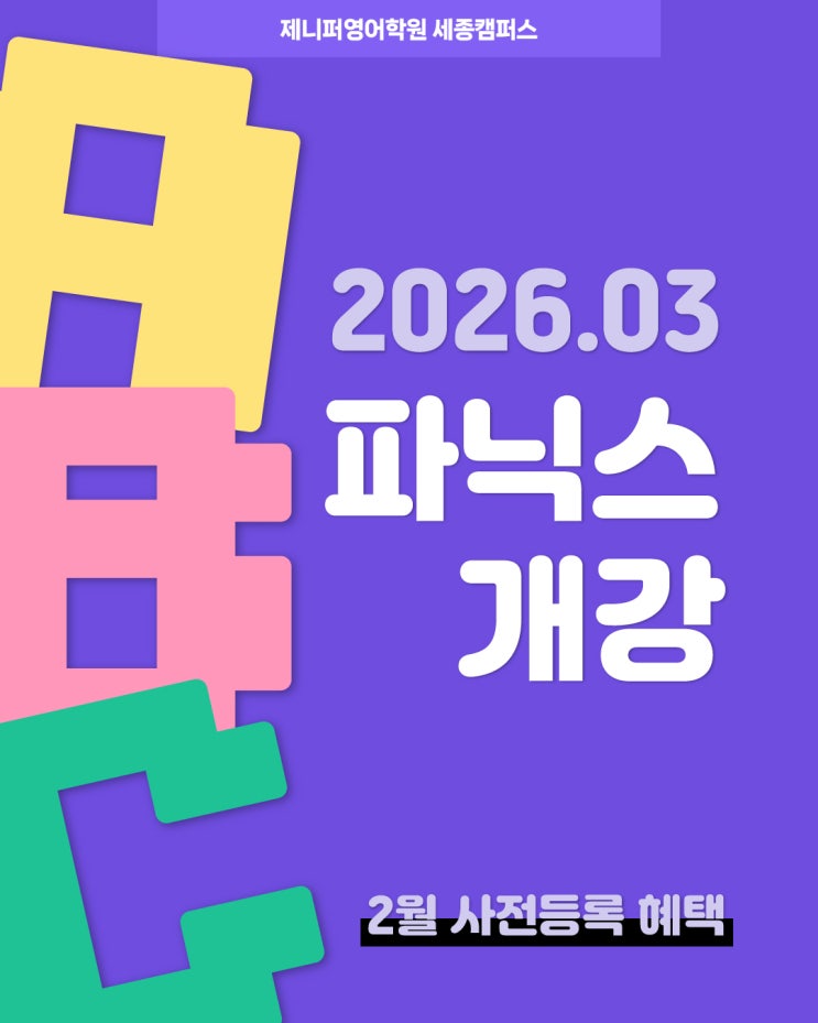 안녕하세요! 제니퍼영어학원 세종캠퍼스입니다 파닉스반 3월 대개강 소식을 가지고 왔습니다!!! 1월 파닉스반에 보내주신 성원에 힘입어 3월에도 개강을 합니다. 수업은 3월 5일 월요일부터 시작합니다 (´▽`ʃ♡ƪ) 주 5회, 3시부터 4시까지 1시간동안 수업을 진행합니다. (원어민수업 포함) 우리 아이들 개학과 동시에 학원에 새로 적응하느라 힘들 수 있어 6개월 동안, 천천히 꼼꼼하게 진도 나갑니다! 2월은 3월을 준비하기에 아주 좋은 시기니까요~ 2월 사전등록시, 혜택 빵빵~!하게 드리는 이벤트를 진행합니다. q(≧▽≦q) 언제든지 학원으로 편하게 문의주세요~^^ 많은 관심 부탁드립니다!! 감사합니다~! 언제나 상담문의는 환....... <img src="https://blogthumb.pstatic.net/MjAyNjAyMDRfMTEw/MDAxNzcwMjA2MDk0MTc2.FLeA6rhDTecVYOBIjN3HXmqNgCanVuc5a_HWVRYMfWQg.ALJgQKVy2hKbQnzmzzxdeuj8V2Bvo6pEEObf0HY65xsg.JPEG/2602-3-%BC%BC%C1%BE_%B4%EB%C1%F6_1.jpg?type=s3" />