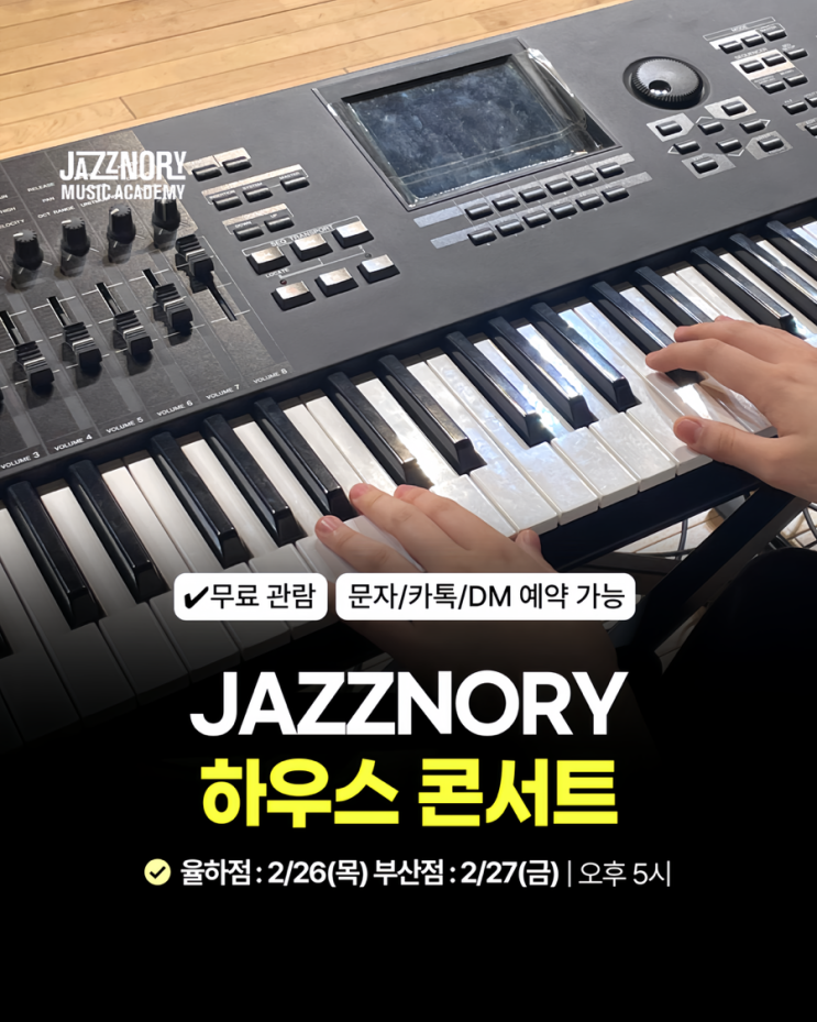 JazzNory 하우스 콘서트 | 부산점&율하점 ✔️무료 관람 : 문자/카톡/DM 예약 가능 율하점 - 일시 : 2/26(목) 오후 5시 - 위치 : 재즈놀이 실용음악학원 경남 김해시 율하3로 45 (3층) - TEL : 010-5195-5422 부산점 - 일시 : 2/27(금) 오후 5시 - 위치 : 재즈노리 실용음악학원 부산 중구 구덕로 52 (4층) - TEL : 010-2822-4424 - - - - - - - - - 입시반 학생들이 한 달 동안 앙상블 클래스에서 함께 고민하고 준비한 무대입니다 :) 각자의 파트를 책임감 있게 연습하였고 서로의 호흡을 맞춰 완성된 곡들로 구성되어 있습니다 ! 멋진 모습 기대해 주세요 감사합니다. - - - - - - - - - JAZZNORY 상담....... <img src="https://blogthumb.pstatic.net/MjAyNjAyMjVfNzIg/MDAxNzcyMDEzNDUxMTU3.2eoFKeHHiaNF5YN3XIPzmZMs6A7M_BLl_076pJCXT4kg.B3vkplQb76ImEGlqb-NR6rIZTDghplrC55IHDT0Ulk0g.PNG/quality%A3%DFrestoration%A3%DF20260224214648890.png?type=s3" />