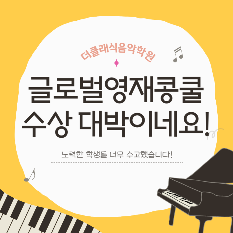 안녕하세요 양산 증산 피아노학원 더클래식음악학원입니다! 겨울방학동안 열심히 연습한 우리 더클래식음악학원의 아이들이 이번에 동아대 다우홀에서 주최한 글로벌 영재 전국음악콩쿠르에 참가를 하였습니다! 아시는 것처럼 저희 더클래식음악학원은 콩쿠르에 엄청난 시간을 투자해서 연습을 하지는 않습니다! 아이들이 다양한 종류의 피아노음악을 경험하고 진짜 음악을 사랑하게 만드는 것이 목표라서 상을 타기 위해서 과도하게 시간을 들여서 몇달동안 한곡만 연주하는 방식으로 연습을 하지도 않고 억지로 무조건 나가는 것도 원하지 않아요! 콩쿨을 준비하면서 좀 더 심화적인 곡을 연주하고 또 무언가에 열중하면서 성취감을 느끼도록 만....... <img src="https://blogthumb.pstatic.net/MjAyNjAyMjZfMzgg/MDAxNzcyMDM1NzgwNjgx.M1mPLE22d24TNVQh8eEBYJ5XTRPQKymA_z7uocZh7XIg.34r-WXwvf4s47t3YPmDzonHXSQqJX3rzCNfjCv9TZtsg.PNG/%C1%A6%B8%F1%C0%BB_%C0%D4%B7%C2%C7%D8%C1%D6%BC%BC%BF%E4_-002_%2814%29.png?type=s3" />