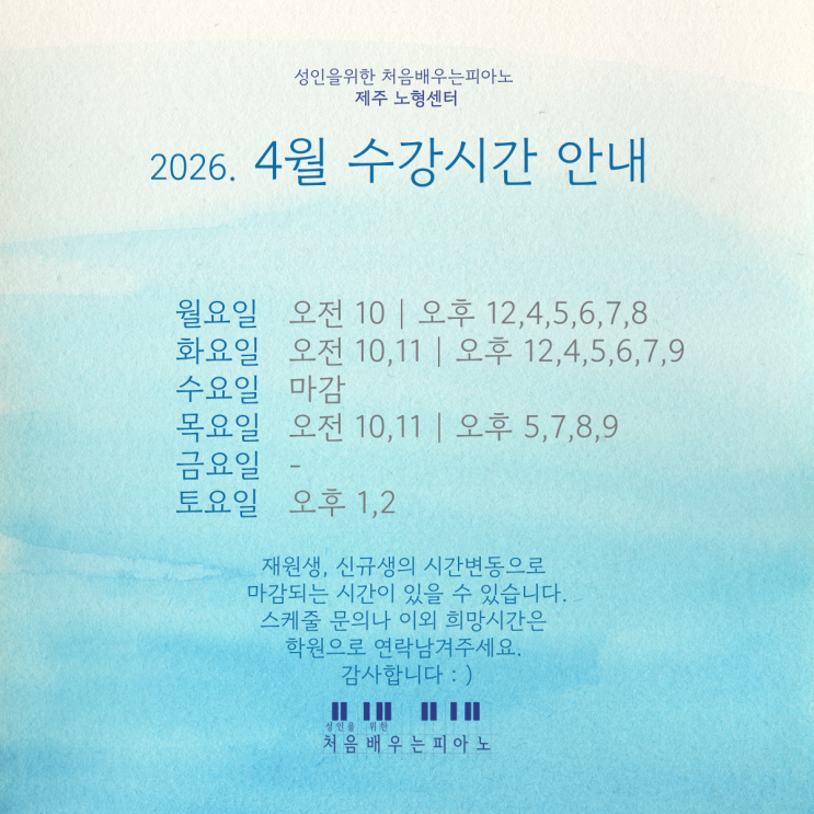 안녕하세요, 처음배우는피아노입니다 :) 따뜻한 봄이 시작되는 4월 ! 새로운 마음으로 피아노를 시작하기 좋은 시기예요. 현재 수강 가능한 레슨 시간을 안내드립니다. 평일 오전 / 오후 일부 시간대 여유 있음 저녁 시간대는 빠르게 마감되는 편입니다 주말은 제한적으로 운영됩니다 (문의 필수) 수강을 원하시는 분들은 원하시는 시간대를 미리 문의 주시면 가장 적합한 시간으로 안내 도와드릴게요 :) 피아노를 처음 시작하시는 분들도, 오랜만에 다시 시작하시는 분들도 편하게 오셔서 음악을 즐기실 수 있도록 준비하고 있습니다. 4월에도 따뜻한 음악과 함께 좋은 시간 보내시길 바랍니다 문의 : 노형센터 010-5798-2387 법원센터 010....... <img src="https://blogthumb.pstatic.net/MjAyNjAzMjVfNDYg/MDAxNzc0NDM2NjI3NjQ2.zyT112pzzIz7pgcNXfy09UuOT_AC4aK-PEY3wQI9mEkg.RtqQ8tIGLbdWDq0C-gHHCd71tywJPVjwrjtN6XoLx9kg.PNG/002.png?type=s3" />