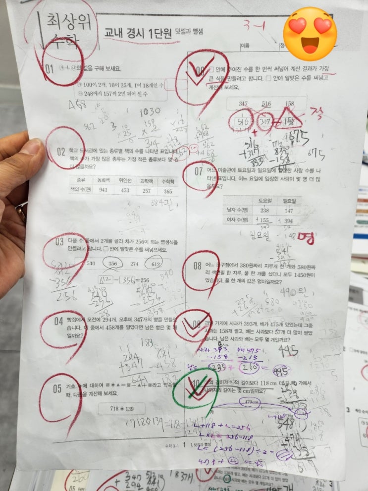 저는 현재학기에 단원평가를 단순 확인 수준이 아닌, 최상위단평 혹은 최상위교재의 교내경시문제까지는 다뤄보고자 합니다. 최상위 수학의 제일 마지막 긴 시험지 초3. 1단원 때때로 아이 수준에 너무 어렵다 느껴져 얻는것보다 잃는게 더 많은 경우에는 풀리지 않거나 앞장만 풀리기도 합니다. 왜냐하면, 공부는 자신감이 더 중요합니다. 초4 친구 문제만 좀 더 꼼꼼히 읽었어도 20번 문제는 충분히 풀었을텐데 아쉽습니다. 초4 친구. 두문제 빼고 스스로^^풀었네요. 잘풀었다고 칭찬했습니다. 옥의 티라면 좀 더 작게 이쁘게 잘 쓰면 좋겠다는^^; 한번에 맞히면 안되는건지^^;; 그리고 무엇보다 글씨를 이쁘게 써야하는데 손에 힘이 없는지 쉽....... <img src="https://blogthumb.pstatic.net/MjAyNjAzMjVfNyAg/MDAxNzc0NDQ4NDI3ODgy.8QAUzktlMysvViM45-Eo-3JeTu5-JgDbxCdBeY9Y39sg.riOBg4AxtC-saEmjCCvJBxdwlwdOUsqLjk4SrKSOnu4g.JPEG/900%A3%DF1774448426997.jpg?type=s3" />