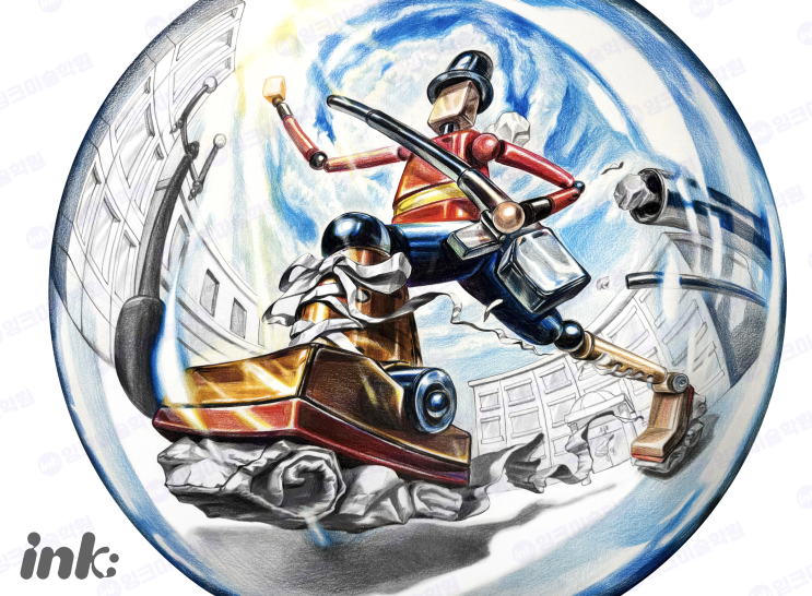 2026학년도 국민대 공업디자인과 합격 재현작입니다. 기본에 충실하면서도 가장 안정적으로 디자인했다고 생각하는 재현작입니다. 형태와 명도, 색, 질감의 기초 조형을 의도에 맞게 충실하게 사용했습니다. 병정의 빨간색 상의와 대비되도록 파란 하늘을 매칭시킨 점과 그 안에서 구름으로 레이어를 만들어서 구분한 점은 명도까지 고려한 학생의 설계를 엿볼 수 있습니다. 그러면서도 전체적으로는 쿨톤과 웜톤의 비율도 잘 조절했습니다. 배경은 무채색으로 그리고 라인 드로잉을 베이스로 표현한 점 역시 사물과 공간을 잘 분리하고 병정을 더 돋보이도록 설계한 의도입니다. 사물의 질감도 적재적소에 적절하게 잘 매칭하였고, 달려가는 병....... <img src="https://blogthumb.pstatic.net/MjAyNjAyMDRfNzUg/MDAxNzcwMTgxNTIwNTY2.t4ONDEPiLifERZBaB94rcehJ7zcMG_RSVJppbCuAu_wg.VsJPE3l7jBxfwv7uXv34CZ6mwvg5heg5UeuFaZG-bfUg.PNG/%BD%BA%C5%A9%B8%B0%BC%A6_2026-02-03_%BF%C0%C8%C4_12.40.57.png?type=s3" />