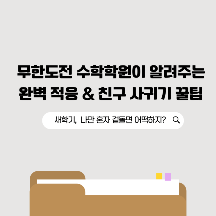 개학을 앞두고 설레기도 하지만, 걱정이 더 앞서는 친구들 있지요? 새로운 교실에 들어설 생각에 밤잠을 설치고 있다면, 그건 너무나 당연한 마음이에요. 성공적인 새 학기 적응을 위해 가장 걱정되는 건 역시 새 학기 친구 사귀기일 텐데요. 오늘 무한도전 수학학원이 여러분의 든든한 내 편이 되어, 마음이 편안해지는 마법 같은 조언을 해줄게요! 부모님들도 곁에서 함께 읽어주시면 더욱 좋습니다. "나만 어색하고 두려운 게 아니야!" 팩트체크 ✔️ 긴 방학이 끝나고 학교에 가는 건 어른들이 긴 휴가 끝에 출근하며 '월요병'을 겪는 것과 똑같아요. 정신건강의학과 전문가들에 따르면, 아이들이 낯선 환경에서 스트레....... <img src="https://blogthumb.pstatic.net/MjAyNjAyMjZfMjY2/MDAxNzcyMDg3MjY1MzU5.lMiI4uZq20RLpVFmesdoBpFwJltj6aAWpOL82D51um4g.PWraDlmrbuleRD4BNxm6My1vIBxZRbu7z46-v6w33mgg.PNG/1.png?type=s3" />