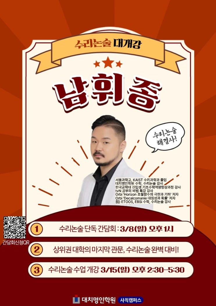 수리논술 남휘종T 단독 간담회 상위권 대학의 마지막 관문, 수리논술 완벽 대비! ✔일시 : 3/8(일) 오후 1시 ✔장소 : 대치명인학원 사직캠퍼스 남휘종T 서울과고 2년 조기수료 KAIST 수리과학과 졸업 대치명인학원 수학, 수리논술 강사 한국공학대 신입생 기초수학역량향상과정 강사 tvN 공부의 비법 특강 강사 Orbi 'Horizon 초월함수의 극한과 기하' 저자 Orbi 'Decalcomanie 대칭성과 확률' 저자 前) ETOOS, EBSi 수학, 수리논술 강사 간담회신청 남휘종T 수리논술 개념완성 3/15 개강 일요일 오후 2:30-5:30 과목 : 수학1,2, 미적분 대상 : 수리논술 시작하는 학생 수업 특징 - 수리논술을....... <img src="https://blogthumb.pstatic.net/MjAyNjAzMDZfMTQx/MDAxNzcyNzg5NjIzMzg2.O2BooV9EFKf_vfonnfMn9pcO-8ABe-dnGN02Hk0VxyAg.7MWW3CAA-oVvPDDSdwSAglvxDuZo1Sly7D5FpYGE61Ug.JPEG/9_d6jUd018svc11rqvrdwioe05_ce0vjw.jpg?type=s3" />