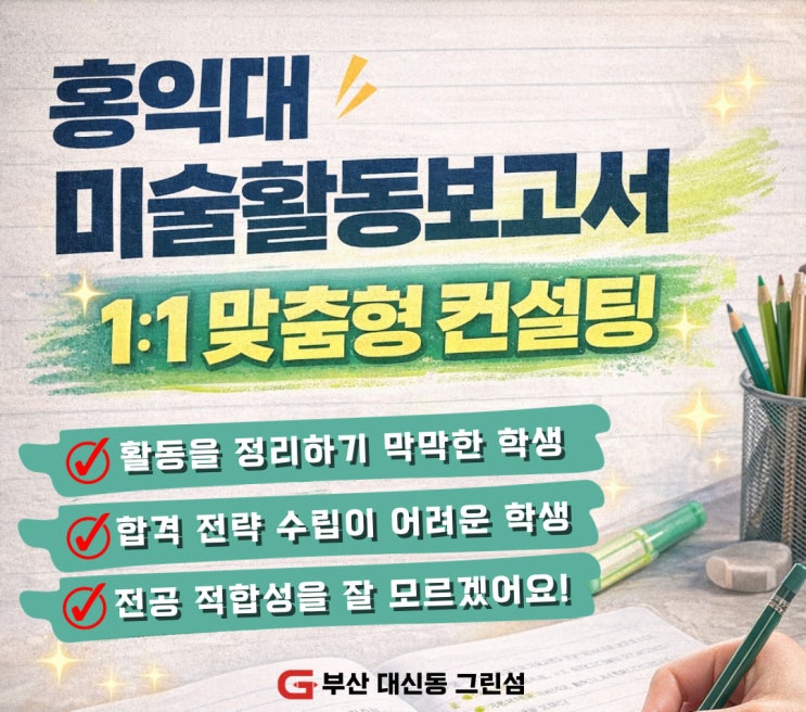 안녕하세요~ 대신동 그린섬 미술학원입니다. 오늘은 대신동 그린섬의 특별한 수업을 소개해드리려하는데요! 바로 홍익대학교 미술활동보고서 작성 수업입니다. 그럼 자세히 알아보도록 하겠습니다~! 홍익대학교 미대 입시는 미술 활동 보고서의 완성도가 합격을 좌우합니다. 하지만 많은 학생들이 ❓ 활동은 많지만 어떻게 정리해야 할지 ❓ 전공 적합성을 어떻게 보여줘야 할지 ❓ 평가 기준에 맞는 구조가 무엇인지 를 정확히 알지 못해 어려움을 겪습니다. 그래서 홍익대 맞춤 미술활동보고서 1:1컨설팅 수업을 개설합니다! ● ● 이 수업은 강의형 수업이 아닌 학생 개인 맞춤 1:1컨설팅 중심 프로그램입니다. ● 지원 학과·전형에 맞춘 개별....... <img src="https://blogthumb.pstatic.net/MjAyNjAyMjNfOTYg/MDAxNzcxODQyMTM3OTE0.Cs6jnx3r7v4VXJifJxpb9qY5ejBMkhEhPFMFabg2AWkg.AcGP6qldNtgRyv35KyRI5lsyr5ez8pnZzWxDFOWJtN4g.JPEG/%C8%AB%C0%CD%B4%EB-%BA%ED%B7%CE%B1%D7-001.jpg?type=s3" />