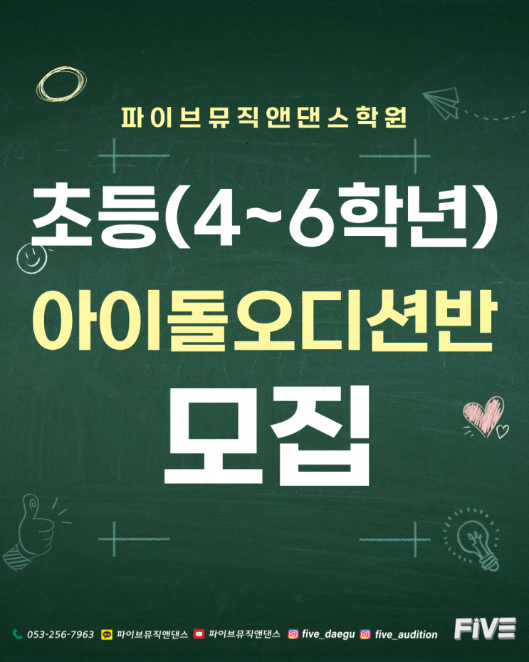 대구 초등 아이돌 오디션반 모집 | 기초부터 시작하는 체계적 트레이닝 안녕하세요, 파이브뮤직앤댄스학원이에요! 아이돌을 꿈꾸는 초등학생들이 많이 묻는 질문중에 하나는 "지금 시작해도 되나요..?" 라는 질문인데요 아마도 오디션 준비시기에 대한 고민과 걱정 때문에 이런 질문을 해주었던 것 같아요 아이돌을 꿈꾸는 초등학생들에게 말해주고싶은 이야기는 바로 오디션 준비 시기도 중요하지만 가장 중요한 건 ‘빨리’가 아니라 ‘제대로’라는거에요! 이 시기에는 실력을 급하게 끌어올리는 것보다 몸의 사용법과 발성 습관을 제대로 잡는 것이 핵심이에요 잘못된 발성이나 잘못된 동작 습관이 자리 잡으면 중·고등 시기에 교....... <img src="https://blogthumb.pstatic.net/MjAyNjAyMjVfNzYg/MDAxNzcyMDExNzU2OTA0.z0i7SV5eJZoyPGub4fjwVtKIgPeRaQsxr_INTalSspUg.x3GtEFqzDJ3xKqOr9192KL8wdYYW0dyLR0DY0-kALBEg.PNG/003.png?type=s3" />