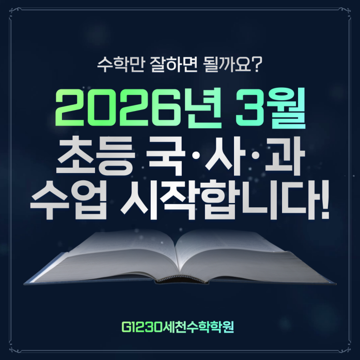 초등 때 잡아야 중·고등이 편해집니다. G1230세천수학학원 '국·사·과 3월 개강' 그동안 수학과 영어 중심으로 기초를 단단히 다져온 우리 아이들. 하지만 학년이 올라갈수록 학부모님들께서 가장 많이 하시는 질문이 있습니다. “국어 독해가 약한데 괜찮을까요?” “사회, 과학은 암기만 하면 되지 않나요?” 정답은 아닙니다. 왜 초등 때부터 준비해야 할까요? 중·고등 내신과 수능은 결국 독해력과 이해력 싸움입니다. ✔ 문제를 정확히 읽어내는 힘 ✔ 긴 지문 속 핵심을 찾는 능력 ✔ 개념을 자기 말로 설명할 수 있는 사고력 이 힘이 바로 초등 국어·사회·과학에서 만들어집니다. 단순 암기로는 중등부터 절대 버틸 수 없습....... <img src="https://blogthumb.pstatic.net/MjAyNjAyMjVfMTIw/MDAxNzcyMDExNzA0Mzk1.vat3dEeAQcn74WLW4mPdSUP06zb1DmfUvnBNsLAJDxgg.sDEm82EAsj1ieejGQJd68QplH2EY1t02_uSQW0xFYBwg.PNG/%C1%A6%B8%F1%C0%BB-%C0%D4%B7%C2%C7%D8%C1%D6%BC%BC%BF%E4_-001_%2828%29.png?type=s3" />