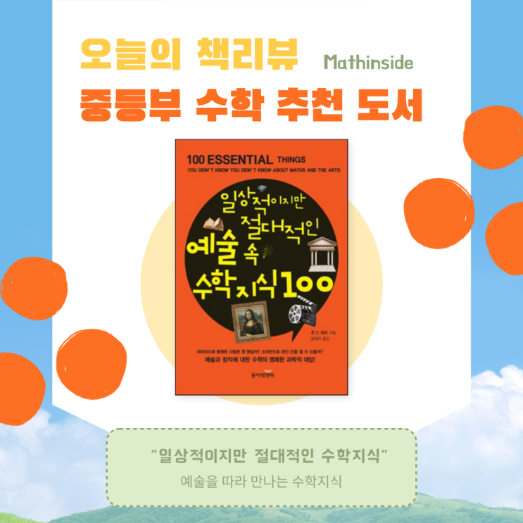 안녕하세요 아이들의 학습 방향을 함께 고민하는 매쓰인사이드 수학학원입니다 . . . . . 수학이 예술이 될 수 있을까? 어차피 수학은 우리 일상이랑 관련도 없어. 학원에서 아이들, 또 부모님들과 이야기하다 보면 이 말을 정말 자주 듣게 됩니다. 복잡한 공식, 시험을 위한 계산, 점수로만 남는 과목. 수학은 그렇게 ‘일상과는 동떨어진 학문’으로 인식되기 쉽습니다. 그런데 이 책은 그 생각부터 아주 부드럽게 뒤집습니다. 수학은 교과서 밖에서 더 자주 등장합니다 『일상적이지만 절대적인 예술 속 수학 지식 100』은 “수학이 어디에 쓰이냐”는 질문에 아주 집요하게, 그리고 재미있게 답하는 책입니다. 이 책에서 다루는 예....... <img src="https://blogthumb.pstatic.net/MjAyNjAyMDdfODgg/MDAxNzcwNDUxNjU5MDM2.Ux1zC-AQYcx4gmJdBAFKxNQqBUIf8hIMmFJ0g0yTIE8g.fjGiCVCGSt0p6up4n70EL470dEW9SyZXd1P9j7LEajcg.PNG/%C3%A5%B8%AE%BA%E4-001_%284%29.png?type=s3" />