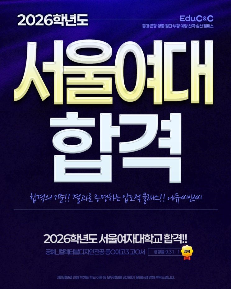 안녕하세요~ 인천 서구 검단신도시 검단미술학원 검단C&C미술학원입니다! 오늘은 2026학년도 서울여대 합격 소식을 전하고자 합니다. 서울여대 공예 컬렉터블디자인전공 경쟁률 9.31:1 정시 합격을 축하합니다!! 검단C&C 미술학원은 오늘도 달립니다 ! 미대입시는 C&C , 합격은 C&C 2025 제1차 전국 연합 C&C 연구작 품평회 최우수상 서울, 경기권 최다 수상! 검증된 선생님들의 실력✍️ ✔ 중등부터 고등까지 이동 없이 한곳에서! ✔ 각 반 담임제 · 학년별 체계적인 수업 검단 씨앤씨미술학원에서는 예비 미술인들의 관심, 대환영 합니다:) 문의사항 032-563-1586 마전역 2번 출구 맞은편 한뫼프라자 5층 #검단....... <img src="https://blogthumb.pstatic.net/MjAyNjAyMjVfMjI0/MDAxNzcyMDE1OTM0Nzgw.lDy08yjMc--39R5nddogebqyWAUl6fyoJkWzOYXPWJYg.3nSunxRJ-t_J23lbfWt3CQe6TSAU6Y8pp4gcQplnqmgg.JPEG/0.jpg?type=s3" />