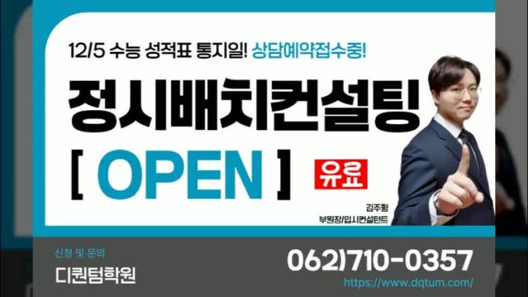 광주 정시컨설팅 입시 명가 수완지구 대성 디퀀텀학원에서 정시배치컨설팅을 오픈해서 현재 상담 예약 접수를 진행하고 있는데, 이번 포스트에서는 이와 관련해서 안내를 드리도록 할게요...^^ 2025년 12월 5일 금요일에 드디어 수능 성적이 통지되었는데, 우리 학생들이 지난 시간 피땀 흘려 얻은 결과가 잘 수확될 수 있기를 염원하며, 광주 정시컨설팅 입시 명가 수완지구 대성 디퀀텀학원에서는 김주형 부원장(입시컨설턴트)이 직접 사전 예약제로 정시배치컨설팅을 진행하고 있습니다. 대성 디퀀텀학원 정시배치컨설팅 01. 프로그램 1) 소요시간 : 50분 2) 준비물 : 수능 성적표 3) 운영 시간 - 평일 : 16시 ~ 23시 - 주말 : 10시 ~ 22시 ※....... <img src="https://phinf.pstatic.net/image.nmv/blog_2025_12_16_2146/jjbpJfPi5q_01.jpg?type=f480x480" />