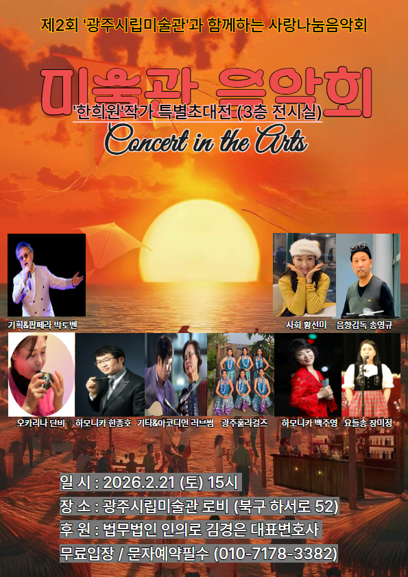 이번주 토요일 (2월 21일) 오후 3시에 광주시립미술관 로비에서 공연이 있습니다 저는 하모니카를 연주합니다 관심있으신 분들의 많은 관람 바랍니다 <img src="https://blogthumb.pstatic.net/MjAyNjAyMThfMTY2/MDAxNzcxMzkzNTkxNzc4.LrmehtyEkzwO0YK8zUpg_b24kN8JO2qGhwCQ4OnxbYAg.JagGzAz1WolzR4U2buFgutEZ2NRJ9RIsZCDEseVFwlAg.PNG/1771393291955.png?type=s3" />