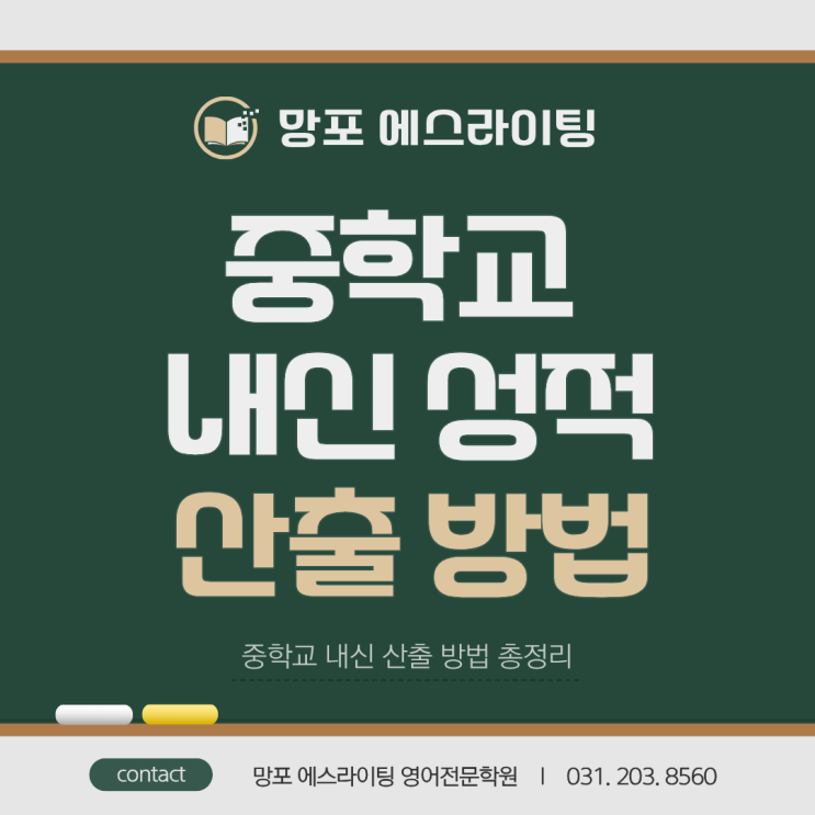 안녕하세요, 망포 에스라이팅 영어전문학원입니다. 중간고사를 마친 뒤, “90점을 넘지 못해서 특목고는 힘들 것 같아요”라며 속상해하는 학생들이 종종 있습니다. 하지만 결론부터 말씀드리면, 아직 전혀 늦지 않았습니다. 내신 산출 방법을 정확히 이해하지 못해 생기는 오해일 뿐이에요. 오늘은 중학교 내신이 어떻게 산출되는지, 그리고 지금부터 어떻게 준비하면 좋은지 차근차근 안내해 드리겠습니다. 1. 내신이란 무엇일까요? 내신은 학교에서 이루어지는 모든 평가를 종합한 성적을 의미합니다. 평가 방식은 크게 두 가지로 나뉩니다. 지필고사: 중간고사, 기말고사 수행평가: 과제, 발표, 프로젝트 등 일반적으로 지필고사의 비중이 더....... <img src="https://blogthumb.pstatic.net/MjAyNjAzMTdfMjIx/MDAxNzczNzMwNjYwNjI4.jRqD7EjxJShrb8ZtQn0S2ZHUPPFKZRdZ_RXnl6-GDdgg.SxkBG9v0WYFQFSE5CaIim1PQl6vq0czfpC7Y13lzHbEg.PNG/%B3%BB%BD%C5_%BB%EA%C3%E2_2.png?type=s3" />