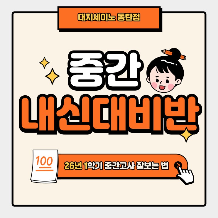 안녕하세요, 대치세이노 동탄점입니다. 새학기 시작한 지 얼마 안 된 것 같지만, 시간은 이미 중간고사로 향하고 있습니다. 이 시기에 가장 많이 나오는 말이 있습니다. “이번 시험은 잘 보고 싶어요.” 그런데 잘 보고 싶은 마음만으로는 안 됩니다. 어떻게 준비하느냐가 결과를 결정합니다. ■ 2026년 1학기 중간고사 대비반 안내 대치세이노 동탄점은 수학 / 과학 / 영어 과목을 과외식 개별진도 수업으로 진행합니다. 중등 내신에서 가장 중요한 건 단순합니다. ✔ 개념을 정확하게 알고 있는지 ✔ 문제를 스스로 풀어봤는지 ✔ 틀린 문제를 제대로 고쳤는지 이 3가지입니다. ■ 세이노 수업은 다르게 합니다 대치세이노 동탄점은 ✔ 한 반....... <img src="https://blogthumb.pstatic.net/MjAyNjAzMTdfNyAg/MDAxNzczNzQ2Nzc4MDM5.AZR_RTdub_60NyCOSQehzU5Rv6hlRFGP1hyg5c_2NjYg.sRUxbensKF5GQDt246RssHy45uYNML6poNqKUBCyJ2Ig.JPEG/%B5%BF%C5%BA-%BC%BC%C0%CC%B3%EB-%B3%BB%BD%C5%B4%EB%BA%F1-001_%281%29.jpg?type=s3" />