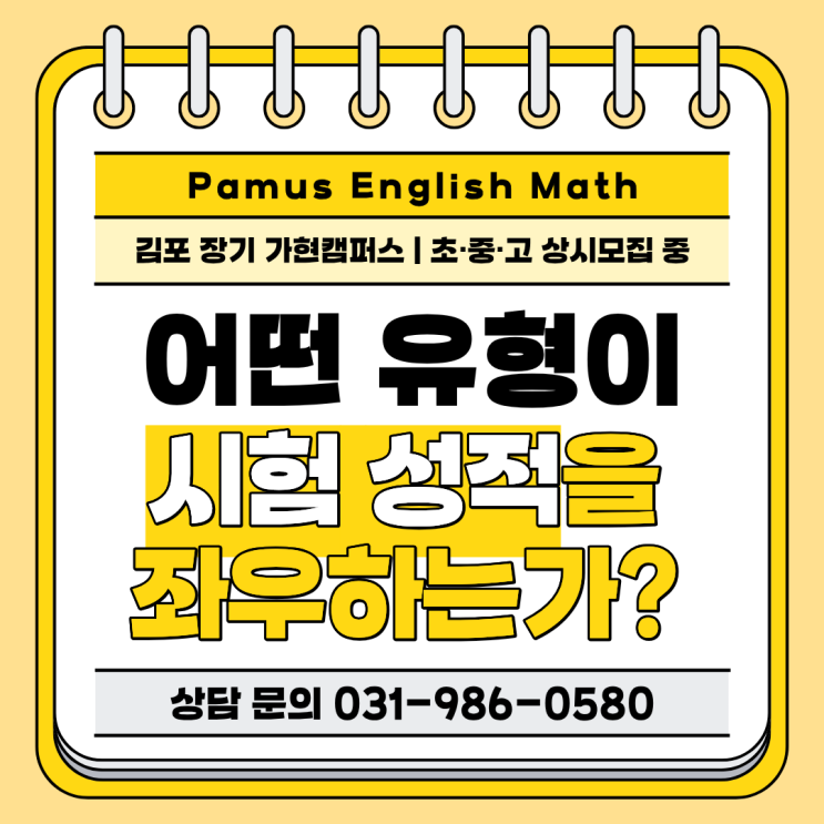 중학생이 되고 나니 휘몰아치는 각종 수행평가와 시험, 따라가기 벅차거나 어떻게 대비해야 하는지 막막했던 경험이 있으실 것 입니다. 저희 파머스 영어 수학 가현캠퍼스에서는 중학생부터 시작되는 내신에 대해 어떠한 방식으로 대처하며 실력을 쌓아야 할지, 그 노하우를 세밀하게 제공하고 있습니다. 자율학기제나 자율학년제로 1학년 2학기부터 시험을 보거나 2학년부터 시험을 봤던 예전과 달리, 현재 김포에서는 1학년부터 시험을 보고 있습니다. 하여, 초장부터 토대를 단단하게 쌓기 위해서는 확실하게 배우고 공부 습관을 만들어 루틴화 하는 것이 중요합니다. 또한 학교 시험 유형에 대비하여 탄탄하게 양질의 공부를 하는 것도 매우....... <img src="https://blogthumb.pstatic.net/MjAyNjAzMjBfMTg2/MDAxNzczOTk0ODM0NDk1.AoVzKquuIK-8XY60xbsa1uzSpfGLgEWkA__iZfi8Tdcg.u-aRnhySv7-T8x7SCBkJ4bRHaaeIn5_KAbuamfRBn3Yg.PNG/%C0%AF%C7%FC_-_%BD%C3%C7%E8_%BC%BA%C0%FB_1.png?type=s3" />
