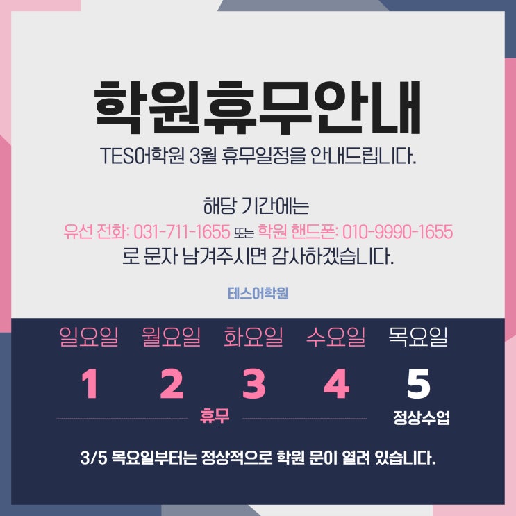TES 테스어학원 3/1 (일) - 3/4 (수) 학원 휴무입니다.