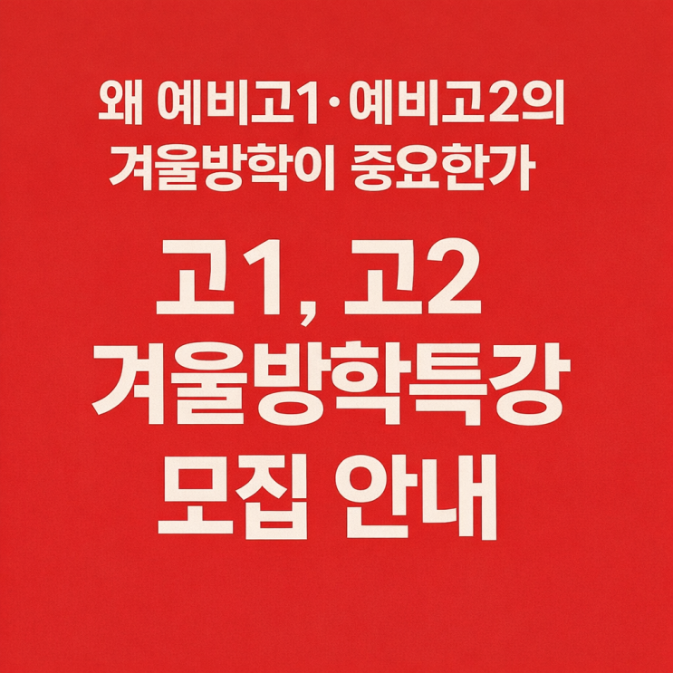 중학교 공부로 고등학교를 버티려 하지 마세요. 예비고1·예비고2, 겨울방학이 성적을 결정합니다. 예비고1 평균 전과목 +15점 예비고2 평균 내신 1.2등급 상승 겨울방학 특강 이후 → 고1·고2 1학기 내신 안정화 성공률 78% 1. 왜 예비고1·예비고2의 겨울방학이 중요한가? 매년 똑같은 장면을 봅니다. 중학교 때는 상위권이었는데, 고1 1학기부터 성적이 급락한 학생 고1 때 “적응기니까 괜찮다”라고 넘겼다가 고2에서 회복하지 못한 학생 공부는 열심히 하는데, 시험 점수는 그대로인 학생 이 학생들의 공통점은 단 하나입니다. 고등학교 공부를 ‘고등학교 방식’으로 준비하지 않았다는 것 고등학교 성적은 ✔ 문제를 많이 풀었는지 ✔....... <img src="https://blogthumb.pstatic.net/MjAyNTEyMjFfMTU3/MDAxNzY2MzIyODMwODM1.LzaYIQZcz-TwhaStMJsLfaHT6AAeKa8WRa0-TBL4sX4g.71bC89xK49QL3JURGFr9Ar_oHkyo9SDpP51BTVJra4wg.PNG/ChatGPT_Image_2025%B3%E2_12%BF%F9_21%C0%CF_%BF%C0%C8%C4_10_12_51.png?type=s3" />