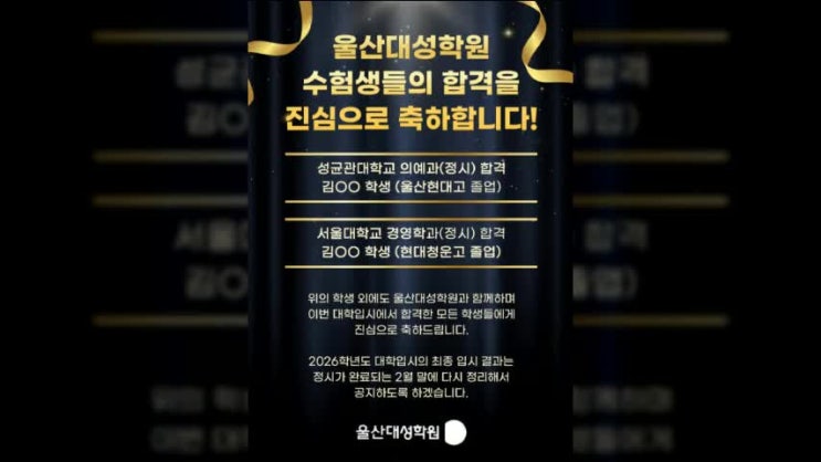 울산대성학원 수험생들의 합격을 진심으로 축하드립니다! 성균관대학교 의예과(정시) 합격 김** 학생(울산대현고 졸) 서울대학교 경영학과(정시) 합격 김** 학생(현대청운고 졸) 위의 학생들 외에도 울산대성학원과 함께하며 2026학년도 대학입시에서 합격한 모든 학생들에게 진심으로 축하드리며, 2026학년도 대학입시의 최종 입시 결과는 정시가 완료되는 2월 말에 다시 정리해서 공지하도록 하겠습니다. 이상 울산대성학원 공식 블로그에서 전해드렸습니다. 감사합니다...^^ <img src="https://phinf.pstatic.net/image.nmv/blog_2026_02_04_753/LZoxjOEky3_01.jpg?type=f480x480" />