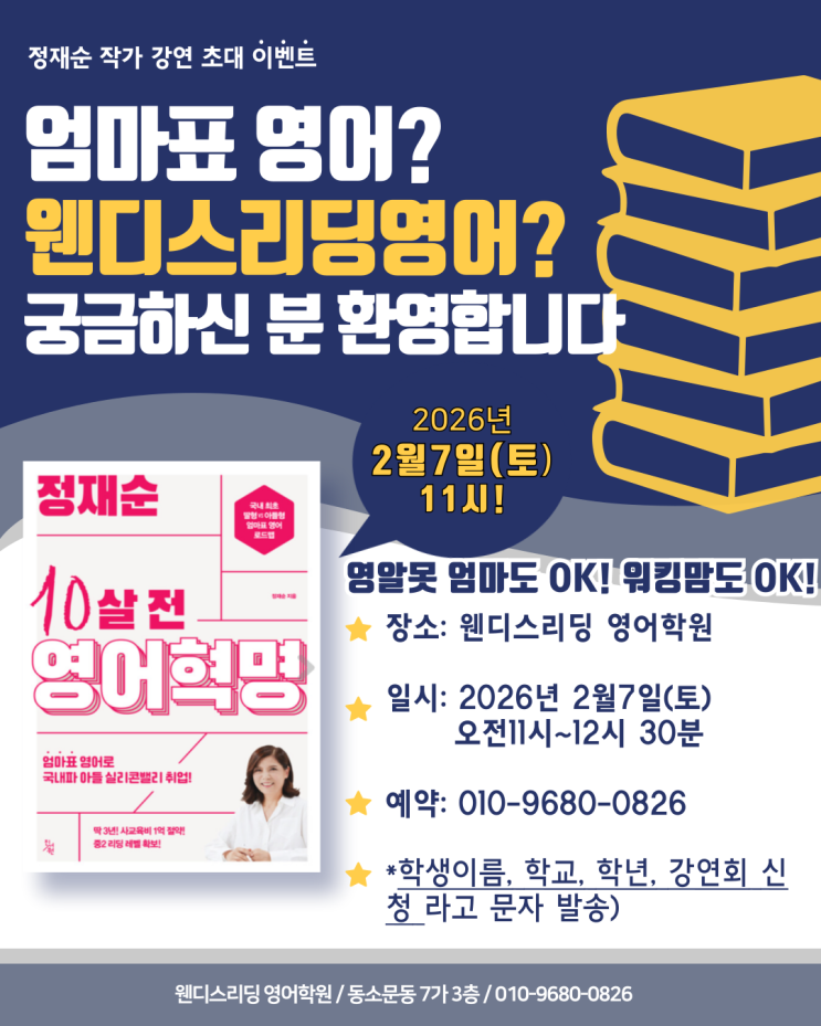 [초등 영어의 방향을 바로 잡는 시간] 『10살 전 영어혁명』 정재순 원장 저자 강연회 영어를 일찍 시작했는데도 왜 아이는 점점 힘들어질까요? 문제는 시작 시기가 아니라 방향과 구조에 있습니다. 이번 토요일 오전11시 『정재순, 10살 전 영어혁명』의 저자이자 오랜 현장 경험을 가진 정재순 원장님을 모시고, ✔ 왜 10살 전 영어가 중요한지 ✔ 무엇을 하고, 무엇은 하지 말아야 하는지 ✔ 초등 이후에도 영어가 무너지지 않는 구조는 무엇인지 학습법이 아닌 ‘판단 기준’을 드리는 시간을 준비했습니다. 초등 영어의 방향이 고민되시는 학부모님께 꼭 도움이 되는 강연이 될 것입니다. *엄마표 영어 하고 계시는 어머님 필수 참석해 주세....... <img src="https://blogthumb.pstatic.net/MjAyNjAyMDNfOTkg/MDAxNzcwMDgxMTU3NDQx.7PMJKfpXAcyt_4TQ9UdMXSfY4b7Dmgdqzjfxl38NAY0g.EOp75UjEfnPQ4pf-AxVSvE06KJCl_ErFd2ioen-Xrycg.PNG/KakaoTalk_20260130_065902215.png?type=s3" />
