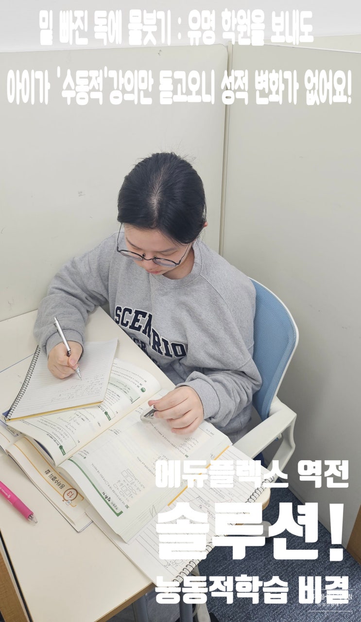안녕하세요! 에듀플렉스 하계점 원장입니다 :) 3월 개학 후, 첫 중간고사를 앞두고 있습니다. 밑고 학원을 보내고 있지만, 지난 시험과 비슷하게 성적이 나올까 불안하신가요? 혹은 비싼 수강료를 내고 이름난 대형 학원을 보내고 있지만, 정작 성적표를 받아보시면 한숨만 나오지 않으셨나요? 우리 아이는 학원 성실하게 잘 다니는데요? 그럼에도 불구하고 성적이 잘 나오지 않는다면 ? 과연 우리 아이가 학원 의자에는 앉아 있지만, 머릿속까지 공부하고 있다고 할수 있을까요? 텍스트로만 존재하던 지식이 아이의 것이 되지 못하고 빠져나가는 "수동적인 학습"의 굴레 이제는 끊어내야 합니다. 에듀플렉스 하계점이 이 굴레를 벗어....... <img src="https://blogthumb.pstatic.net/MjAyNjAzMTRfMTE3/MDAxNzczNDYwMzg4MTgw.xzOB7lAh9s732Te73k-bYsUWqm5jp0xsGQLxr6T4cYcg.1t_EqZ9RJRsV58oIqfoVNnxnBfn3KFMo94wwYSYGCe4g.JPEG/KakaoTalk_20260314_120040655.jpg?type=s3" />