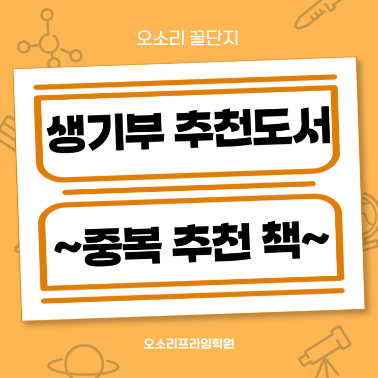 안녕하세요~ 오소리프라임학원입니다! 영재학교나 과학고를 준비하는 학생들이라면 생기부에 어떤 책을 기록해야 할지 한 번쯤 고민해 보게 됩니다. 특히 독서 활동은 단순히 책을 많이 읽는 것보다 어떤 책을 선택하고 어떤 관점으로 읽었는지가 중요한데요. 그래서 이번 글에서는 2025학년도 영재학교 추천도서 목록 중에서도 여러 학교에서 중복으로 추천된 책들을 정리해 보았습니다. 1. 『컴퓨터과학이 여는 세계』 – 이광근 분야: 수리정보 추천 학교: 한국과학영재학교 · 인천과학예술영재학교 · 광주과학고 세 영재학교에서 모두 추천한 대표적인 컴퓨터과학 교양서다. 이 책은 단순한 프로그래밍 입문서가 아니라 알고리즘, 계산 가능....... <img src="https://blogthumb.pstatic.net/MjAyNjAzMTFfMTE4/MDAxNzczMjIwNTI4ODAw.5Ha32WYSLRgp8GDKTGfKHbF8us5XjOzC-pRGPFSRhGIg.6k-Hv4GUh59wy7XhDc0b5JQMF2pqJEVPxbMbMKJ1gz0g.PNG/%BA%ED%B7%CE%B1%D7_%287%29.png?type=s3" />