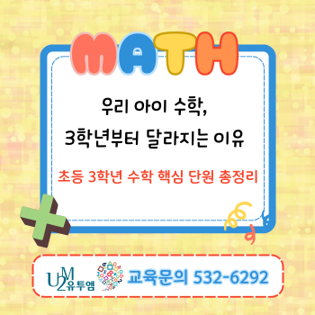 안녕하세요, 유투엠 서초방배캠퍼스입니다. “초등 2학년까지는 곧잘 하던 수학인데, 3학년 들어서 갑자기 어렵다고 해요.” 상담을 하다 보면 초등 3학년 학부모님들께 가장 많이 듣는 말입니다. 사실 초등 3학년은 수학이 처음으로 ‘개념 암기’에서 ‘이해와 사고’로 바뀌는 시기입니다. 이때 어떤 단원을 어떻게 잡느냐에 따라 아이의 수학 자신감은 완전히 달라집니다. 초등 3학년 수학, 왜 중요한가요? 초등 1~2학년 수학이 ‘계산 익히기’ 중심이었다면, 3학년부터는 개념을 이해하고 설명해야 하는 수학이 시작됩니다. ✔ 계산이 길어지고 ✔ 문제를 읽고 해석해야 하며 ✔ “왜 이렇게 되는지”를 묻는 문장제가 등장합니다. 이 시기....... <img src="https://blogthumb.pstatic.net/MjAyNjAxMjNfNDkg/MDAxNzY5MTcwNDQwNjQy.XPsxvoy4-B8HHsc59WntrWg6qpLrod8Aqq8xOyDiYQ0g.GoL4K7NLC5R6Ce4bxZuUzDW21fDlRksZAglvmW1d2Fcg.PNG/%C3%CA3%BC%F6%C7%D0.png?type=s3" />