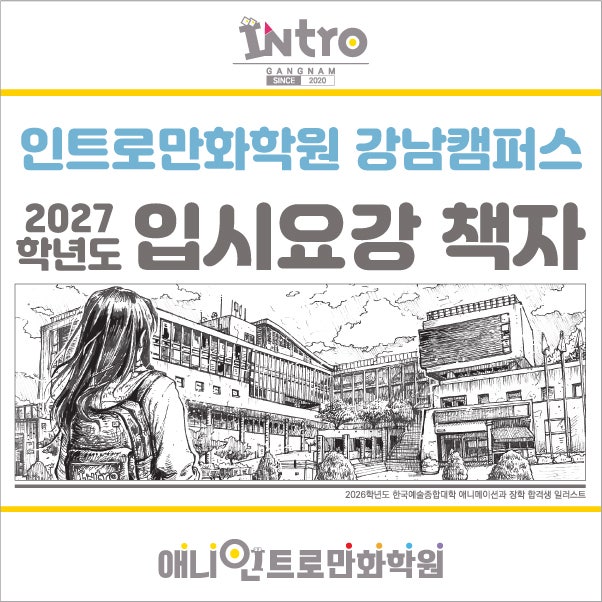 강남 만화학원은 역시 애니인트로 안녕하세요! 인트로 만화학원 강남캠퍼스입니다!~ 이번 포스팅은 매해 3월에 만화/애니/게임 입시를 원하는 학생 및 학부모님들을 위하여 입시요강책자를 자체 출판을 하고 있는데요! 전국의 주요 입시대학들의 전형과 요강들을 정리하여 올해는 2월달에 출판을 하였습니다!~ 많은 애니/만화/게임 대학들이 존재하지만 학부모님들께서는 잘 모르시는 부분들이 있어 실기전형유형과 포트폴리오전형 유형들을 정리해 보았어요! 재원생들은 물론 방문하여 상담하시는 학생들과 부모님들께도 모두 무료로 배포하고 있으니 궁금하신 분들은 언제나 방문상담 예약을 해주시면 감사하겠습니다!~ 먼저 표지는 2026학년도....... <img src="https://blogthumb.pstatic.net/MjAyNjAyMjNfMTgy/MDAxNzcxODIyMDk1NzI1.TvMiB5R63oAIAp7zIhBG2mvvTuJqSLd-tSYx1vaT2-Qg.NQoNR0wEYciSaZjbp8hc0eCt4JRvBONOEVPp6eRkNJgg.JPEG/00_%BD%E6%B3%D7%C0%CF.jpg?type=s3" />