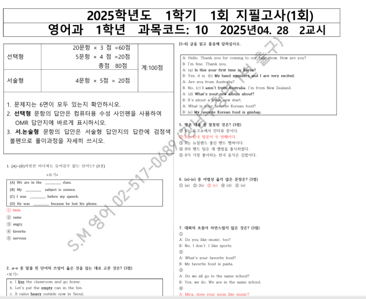 [심상민영어] 언주중학교 2025년1학년1학기영어 기출분석및 예상문제