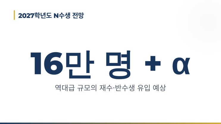 1) 의대 변수 + 작년 ‘불수능’ 여파… N수생이 16만명대까지 커질 수 있다 올해(2027학년도) 수능판은 N수생(재수·반수 등) 규모가 역대급으로 커질 거라는 전망이 나옵니다. 기사에서는 **“16만명+α”**까지도 거론돼요. 섭수학과학학원 월성동수학학원 월성동과학학원 배경으로는 의대 정원 확대, 지역의사제(지역의사 전형) 변수, 그리고 작년 수능 난이도 체감(불수능)으로 인한 재도전 심리가 같이 얽혀 있다고 봤습니다. 정시 모집 인원은 줄어드는데(자리 감소), 지원과 경쟁은 오히려 늘어나는 흐름이 겹치면 “한 번 더”가 빨리 시작된다는 분석이죠. 섭수학과학학원 월성동수학학원 월성동과학학원 여기서 포인트는 “재수생이 많....... <img src="https://blogthumb.pstatic.net/MjAyNjAyMTBfMjk5/MDAxNzcwNzA4MjEyMTY3.1BZzdS7qis0HytqTyNGwyxhOwifZW7AAoreK98krmtog.65yfjvqjEz6vIs9yfGMZKkMJqVFmMlXnCNGbCCHZomgg.JPEG/img-3.jpg?type=s3" />