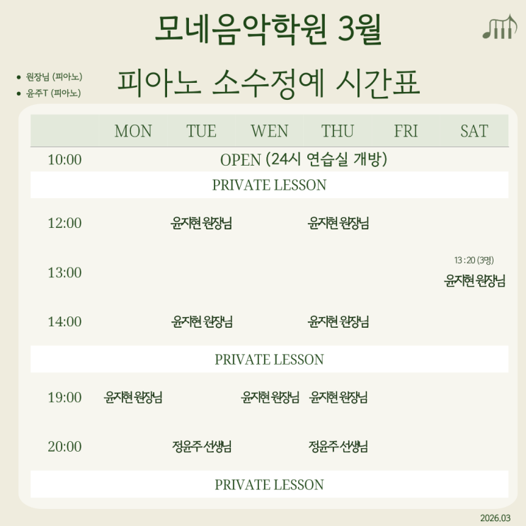 26년 3월 피아노 소수정예 시간표 - 울산성인피아노