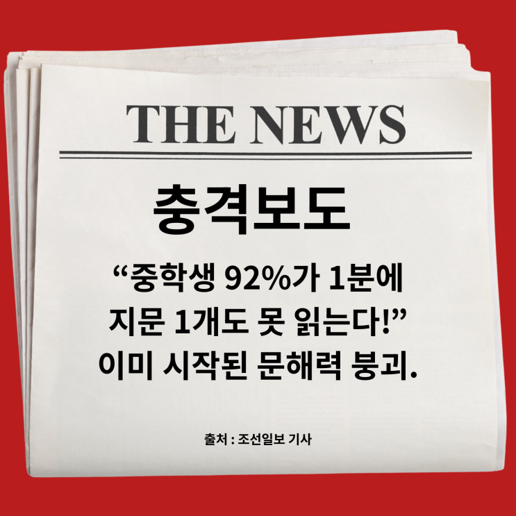 최근 조선일보 보도에서 눈에 띄는 기사가 있었습니다. 제목은 “중학생 92%가 1분에 지문 1개 못 읽는다”는 내용이었죠. 단순한 속도 문제가 아닙니다. 글을 끝까지 정확히 읽고 이해하는 힘, 즉 문해력의 붕괴를 이야기하는 기사였습니다. 문해력, 왜 이렇게 중요할까요? 요즘 아이들은 글을 “읽는다”기보다 “훑는다”는 표현이 더 맞습니다. 짧은 영상과 자극적인 콘텐츠에 익숙해지면서 한 문단을 차분히 읽고 의미를 구조화하는 힘이 약해지고 있습니다. 문해력이 부족하면 생기는 문제는 분명합니다. 수학 문장제를 읽고도 무엇을 묻는지 모른다 사회·과학 교과서를 읽어도 핵심이 남지 않는다 시험에서 지문 이해에 시간이 오래....... <img src="https://blogthumb.pstatic.net/MjAyNjAyMjVfMTU1/MDAxNzcxOTg0NDQzODA4.A9QblUgn6U5qt-W_iEe3WCXZipmMs-3l7kND-dnBjqgg.Hx9BmkXQKYIzVrG31LEmDcbT0wIpwltsjg6541Rrfxsg.PNG/Red_and_White_Typographic_New_Year_Card_.png?type=s3" />