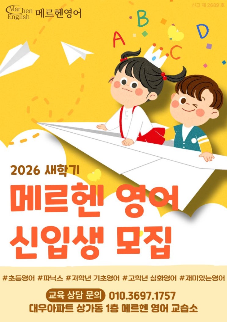 안녕하세요 메르헨 영어입니다 새로운 학기, 아이의 영어 첫 출발을 즐겁고 탄탄하게 시작하고 싶다면 메르헨 영어와 함께하세요! 종이비행기를 타고 날아오르는 아이들처럼 영어도 부담 없이, 신나게, 자연스럽게 ✨ 메르헨 영어는 놀이 + 학습 + 성취감을 모두 담은 수업으로 아이들이 영어를 ‘공부’가 아닌 즐거운 경험으로 받아들이도록 지도합니다. 메르헨 영어 수업 특징 ✔ 파닉스 기초부터 탄탄하게 ✔ 초등 저학년 기초영어 → 고학년 심화영어까지 체계적인 커리큘럼 ✔ 말하기 · 듣기 · 읽기 · 쓰기 균형 잡힌 수업 ✔ 게임, 활동, 스피킹 중심의 재미있는 영어 아이 수준에 맞춰 소수 정원 맞춤 수업으로 진행되며, 기초....... <img src="https://blogthumb.pstatic.net/MjAyNjAyMjhfMjE5/MDAxNzcyMjg2OTI3NzUz.cjozyxNxXKRS6txR091tQ5bS8ijbH1liVxpz_-ARTZcg.QoWUNwrQT2SNQXs3D5p5twcEMjbxfYe7dNXXa12ZrJUg.JPEG/6.jpg?type=s3" />