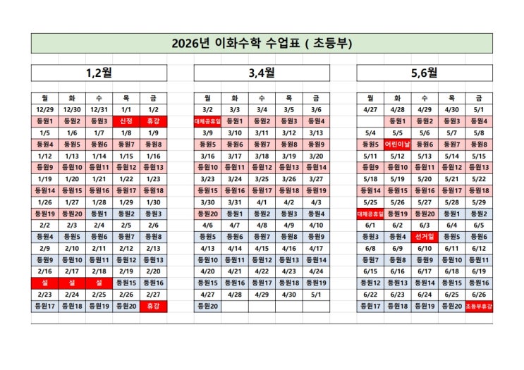 안녕하세요!? 이화수학학원입니다. 2026년도 수업계획표를 공지합니다. 초등부는 월 20회에 맞춰서 수업하고 있습니다. 공휴일 변동사항에 따라 수업계획은 바뀔 수 있습니다. 초등부는 대체공휴일을 포함한 모든 공휴일 휴강이며 1/2, 2/27, 6/26, 12/31일은 수업 시수 만족으로 휴강입니다. 여름방학은 8/11~8/14일입니다. 감사합니다. <img src="https://blogthumb.pstatic.net/MjAyNTEyMDlfMTQ0/MDAxNzY1MjgxMjYzMDQx.tBEo9yBTbBVfTrzwHjA_uFe8-Z-p4WpDgY7JvXC70Hkg.OFG2cdczrdV7kMcAsTJwtoO8wHMUsUqLQi1fJmih9Kcg.JPEG/%C1%BE%C7%D5_1.jpg?type=s3" />