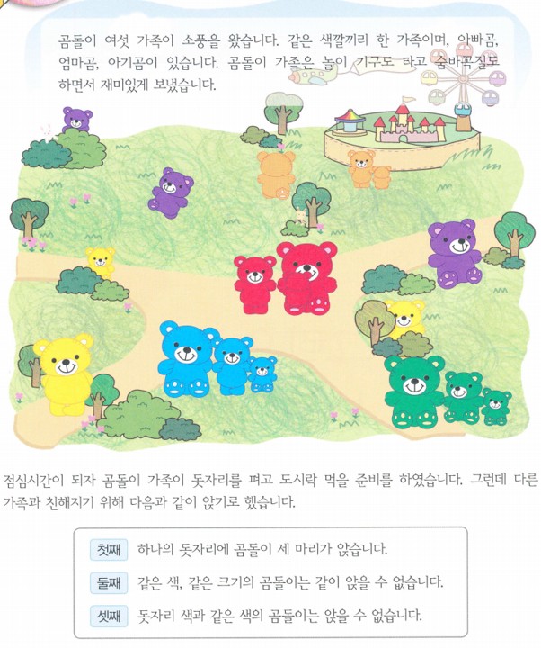 우리 반포시매쓰 1학년 친구들은 요즘 교재를 공부하고 있어요. 오늘 활동은 곰돌이 세트를 이용하여 각각의 속성이 겹치지 않게 분류를 해보고, 또 분류된 것을 보면서 곰돌이의 속성을 역으로 유추하며 긍정문과 부정문으로 나타내보는 활동을 하였어요. 활동을 하기 전에 우선 각자 곰돌이 세트를 가지고 어떤 속성이 있는지 함께 이야기해 보았어요.^^ 곰세마리 노래에 맞게 "아빠곰~ 엄마곰~ 아기곰!" 이야기 한 친구도 있었고, 또 같은 음을 붙여 "빨간색~노란색~ 파란색~" 등을 이야기하며 자연스럽게 속성을 파악하고 돗자리의 색과 동일한 색을 가지고 있다는 것을 확인했....... <img src="https://blogthumb.pstatic.net/MjAyNjAzMjdfNTEg/MDAxNzc0NjA2Mjk0OTk4.D3KxOAOfbr54eHbkS2_XkNv1N8XZhnPVCKuETSbWVJMg.ozVtWLzzE4iglo7GD-oFRUjig580ihTtbEtvSHwqWb4g.JPEG/%B1%D7%B8%B21.jpg?type=s3" />