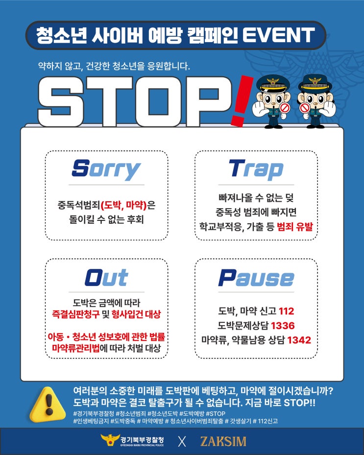 4월 2일은 ‘사이버 범죄 예방의 날’! 작심과 경기북부경찰청이 우리 학생들의 안전한 일상을 위해 뭉쳤습니다! 청소년을 위협하는 사이버 도박 우리의 소중한 꿈과 시간을 뺏을 순 없죠! ♂️♀️ ✅ 참여 방법 1. 작심(@zaksim_officia)l & 경기북부경찰청(@gyeonggi_b_pol) 인스타그램 팔로우! ✨ 2. 이벤트 게시물 댓글로 퀴즈 정답 남기기! [QUIZ] 청소년의 안전한 사이버 세상을 위해 지정된 4월 2일은 무슨 날일까요? (힌트: ㅅㅇㅂ ㅂㅈ ㅇㅂㅇ ㄴ / 카드뉴스 속에 정답이 있어요! ) 3. 경찰 굿즈 탐나는 친구 태그하면 당첨 확률 UP! 이벤트 일정 1. 이벤트 기간: 3/30 (월) ~ 4/12 (일) 2. 당첨....... <img src="https://blogthumb.pstatic.net/MjAyNjAzMzBfMjk2/MDAxNzc0ODM0ODkyMzQy.9LMK1El61Wtxz3YvBRb3VXpJ4ca24CSPUvqJcOhbqWkg.oSWoEzcddNyvFskNCz9VMfdUGMFQ0Zuzo8Ud_WFiBk0g.JPEG/260325_%B0%E6%B1%E2%BA%CF%BA%CE%B0%E6%C2%FB%C3%BB_%C3%BB%BC%D2%B3%E2_%BB%E7%C0%CC%B9%F6_%BF%B9%B9%E6_%C4%B7%C6%E4%C0%CE_%C0%CC%BA%A5%C6%AE_%C0%CE%BD%BA%C5%B8%B1%D7%B7%A5_%BC%D2%C0%E7_%281%29.jpg?type=s3" />